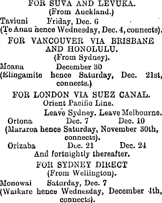 FOR SUVA AND LEVUKA. (From Auckland.) Taviuni Friday, Dec. 0 (X’e Anuu hence Wednesday, Dec. 4, connects). FOR VANCOUVER VIA BRISBANE AND HONOLULU. (From Sydney). Moana December 30 (Elingamite hence Saturday, Dec. 21st, connects.) FOR LONDON VIA SUEZ CANAL. Orient Pacifio Line. Leave Sydney. Leave Melbourne. Ortona Dec. 7 Dec. 10 (Mararoa hence Saturday, November 30th, connects). Orizaba Dec. 21 Dec. 24 And fortnightly thereafter. FOR SYDNEY DIRECT (From Wellington). Monowai Saturday, Dec. 7 (Waikare hence Wednesday, December Ith, connects).