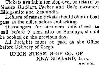 Tickets available for stop- over or return by Messrs Huddart, Parker and Co.’s steamers Elingainite und Zeaiandia. Holders of return tickets should obtain boat pass at the ollice before embarking. fPassengers for steamers advertised to sail before 9 a.m., also on Sundays, should be booked on the previous day. All freights must be paid at the Office before Delivery of Cargo. UNION STEAM SHIP CO. OF NEW ZEALAND, Ltd., Aoents.