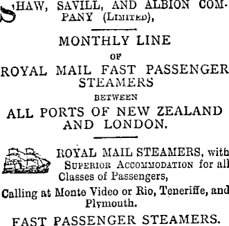 i HAW, SAVILL, AND ALBION COM--31 PANY (Limited), MONTHLY LINE OF ROYAL MAIL FAST PASSENGER STEAMERS BETWEEN ALL PORTS OF NEW ZEALAND AND LONDON. ROYAL MAIL STEAMERS, with Superior Accommodation for all Classes of Passengers, Calling at Monto Video or Rio, Teneriffe, and Plymouth. FAST PASSENGER STEAMERS.