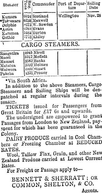 CARGO STEAMERS. 'Via South Africa. In addition to the above Steamers, Cargo Steamers and Sailing Ships will _be despatched at regular intervals during the season. , TICKETS issued for Passengers from Great Britain for .€l7 (is and upwards. The undersigned are empowered to grant Passages from London to New Zealand, payment for which has been guaranteed in the C °I>ALRY PRODUCE carried in Cool Chambers or Freezing Chamber at REDUCED KATES. „ . , v Wool, Tallow Flax, Gram, and other New Zealand Produce carried at Lowest Current Rates. For Freight or Passage apply to— BENNETT & SHERRATT; OR COMMON, SHELTON, & CO. Agents.