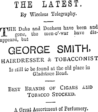 THE LATEST. By Wireless Telegraphy. THE Duko and Duchess have been and gone, the meii'O’-war base uisappeard, but GEORGE SMITH. HAIRDRESSER & TOBACCONIST Is still to be found at the old place in Gladstone Road. Best Brands or Cigars and Tobacco Stocked. I A Great Assortment of Perfumery.