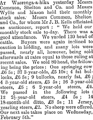 Ax Waerenga-a-hika yesterday Messrs Common, Shelton and Co. and Messrs Wyllie and Mason held their monthly stock sales/ Messrs Common, Shelton and Co., for whom Mr J. B. Kells officiated as auctioneer, report : “ We held our monthly stock sale to-day. There was a good attendance. We yarded 120 head of cattle. Buyers were again inclined to caution in bidding, and many lots were passed, nearly all, however, being sold afterwards at rates equal to those ruling at recent sales. We sold 80 head, the following being the prices : One springing cow i£6 ss; 37 3-year-olds, £5 10s; 4 fat bullocks, i£6 ss; 9 bullocks, nearly fat, ; 4 3-year-old steers, £5 5s ; 16 3-year-old steers, £5 ; 6 2-year-old steers, £4. We passed in the .following lots : 12 24-year-old steers, £4 5s ; 14 18-month-old ditto, £3 ss; 11 Jersey, yearling steers, £2. No sheep were offered. Our next sale takes place on Wednesday, February sth.”