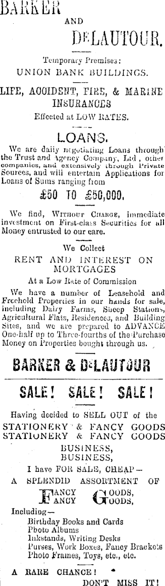 BAKKtiU AND MjADTOOB.I Temporary Premises: UNION BANK BUILDINGS. LIFE, AOOIDSNT, FIRE, & MARINE INSURANCES Effected at LOW KATES. LOANS. Wc ure dttiiy negotiating Loans through the Trust and Agnncy Company, Ltd , other companies, and extensively through Private Sources, and will entertain Applications for Loans ol Sums ranging from £SO TO £50,000, We find, Without Ciiahge, immediate investment on First-class Securities for nil Money entrusted to our care. We Collect RENT AND INTEREST ON MORTGAGES At a Low Rate o! Commission We have a number of Leasehold and Freehold Proponies in our hands for sale, including Dairy Farms, Siiecp Stations, Agricultural Flats, Residences, and Building Sites, and we are prepared to ADVANCE One-half up to Three-fourths ol thed’urchase Money on Properties bought through us. BARKER & Dt'LAUTWR SALE! SALE! SALE! Having decided to SELL OUT of the STATIONERY & FANCY GOODS STATIONERY & FANCY GOODS BUSINESS, BUSINESS, I have FOR SALE, CHEAPA SPLENDID ASSORTMENT OF T7UNCY y-'i GODS, JO ANGY 'OTOODS, Including Birthday Books and Cards Photo Albums Inkstands, Writing Desks Purses, Work Boxes, Fancy Brackets Photo Frames, Toys, etc., ote. A RARE CHANCE! DON’T MISS IT!