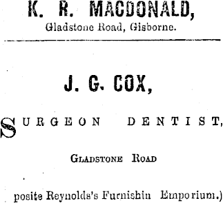 K. R. MACDONALD, Gladstone Road, Gisborne. J. G, COX, DENTIST, Gladstone Koad posite Reynolds’s Furnishin Emporium.)
