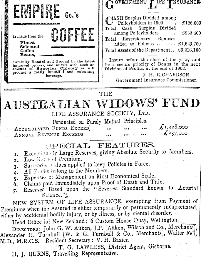 EMPIRE Co.’s I» mads from tha Finest Selected COFFEE Carefully Roasted and Ground by the latest improved process, and mixed with such an amount of Superior Chicory as will produce a really beautiful and refreshing beverage. GOVERNMENT ASH Surplus Divided among Policyholders in 1900 .. £126,600 Total Cash Surplus Divided among Policyholders .. £833,100 Total Reversionary Bonuses added to Policies .. .. £1,629,700 Total Assets of the Department.. £3,216,100 Insure before the close of the year, and thus secure priority of Bonus in the nest Division of Profits, at the end of 1902. J. H. RICHARDSON, Government Insurance Commissioner. JNSURANCETHE AUSTRALIAN WIDOWS’ FUND LIFE ASSURANCE SOCIETY, Ltd. Conducted on Purely Mutual Principles. Accumulated Funds Exceed,' £ 1,428,000 Annual Revenue Exceeds ... £ 237,000 RECTAL FEATURES. 1. Excel'' -'". -Hv Large Reserves, giving Absolute Security to Members. 2. Low R : -Premium. 3. Sururch '.'.dues applied to keep Policies in Force. 4. All I’;o!i>> belong to the Members. 5! Expenses of Management on Most Economical Scale. 6. Claims paid Immediately upon Proof of Death and Title. 7. Reserves Based upon the “Severest Standard known to Acturial Science.”], NEW SYSTEM OF LIFE ASSURANCE, exempting from Payment of Premiums when the Assured is either temporarily or permanently incapacitated, either by accidental bodily injury, or by illness, or by mental disorder. Head Office for New Zealand: 6 Custom House Quay, Wellington. DrRECTORS: John G. W. Aitken, J.P. [Aitken, Wilson and Co., Merchants], Alexander H. Turnbull [W. & G. Turnbull & Co., Merchants], Walter Fell, M.D., M.R.C.S. Resident Secretary : V. H. Baxter. T. G. LAWLESS, District Agent, Gisborne. H. J. BURNS, Travelling Representative.