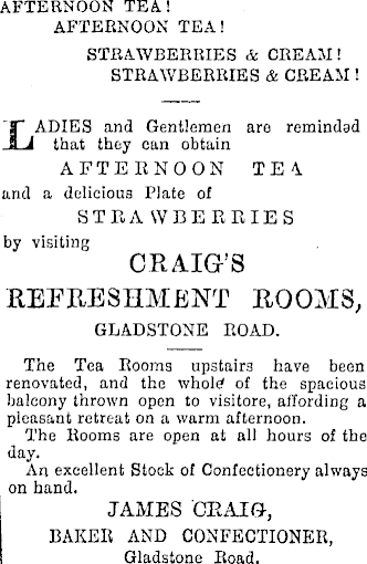 AFTERNOON TEA! AFTERNOON TEA! STRAWBERRIES & CREAM! STRAWBERRIES & CREAM! LADIES and Gentlemen are reminded that they can obtain AFTERNOON TEA and a delicious Plate of STRAWBERRIES by visiting CRAIG’S REFRESHMENT ROOMS, GLADSTONE ROAD. The Tea Rooms upstairs have been renovated, and the whold of the spacious balcony thrown open to visitore, affording a pleasant retreat on a warm afternoon. The Rooms are open at all hours of the day. An excellent Stock of Confectionery always on hand. JAMES OEAIG-, BAKER AND CONFECTIONER, Gladstone Road.
