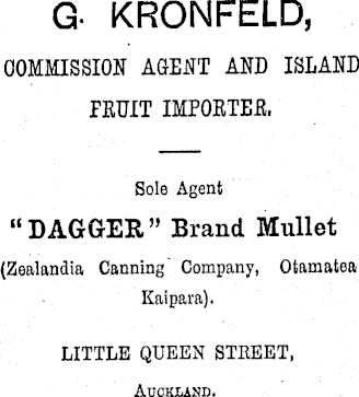 G- KRONFELD, COMMISSION AGENT AND ISLAND FRUIT IMPORTER, Sole Agent “DAGGER” Brand Mullet (Zealandia Canning Company, Otamatea Kaipara). LITTLE QUEEN STBEET, Auckland.