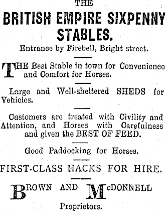 THE BRITISH EMPIRE SIXPENNY STABLES. Entrance by Fire bell, Bright street. THE Best Stable in town for Convenience and Comfort for Horses. Large and Weil-sheltered SHEDS for Vehicles. Customers are treated with Civility and Attention, and Horses with Carefulness and given the BEST OF FEED. Good Paddocking for Horses. FIRST-CLASS HACKS FOR HIRE. iROWN AND Proprietors.