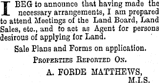 I BEG to announce that having made the necessary arrangements, I am prepared to attend Meetings of the Land Board, Land Sales, etc., and to aot as Agent for persons desirous of applying for Land. Sale Plans and Forms on application. Pbopebties Bepobted On. A. FOBDE MATTHEWS, M.I.S.