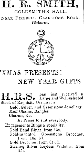 H. R. SMITH, GOLDSMITH’S HALL, Near Firebell, Gladstone Road, Gisborne. ’XMAS PRESENTS! NEW YEAR GIFTS Hit? bae 3 ust received a o JLAjo Oo Large and Wi 11-selected Stock of Exquisite Designs in Gold, Silver, and Greenstone Jewellery Mull Chains, Bangles Charms, &c. At Prices to suit everybody. Engagements Rings a speciality. Gold Band Rings, from I3s. Gold-m runted Greenstone Brooches, l'ora 10s Gd. Gold Brooches, from Gs Gd. Sterling Silver Keyless Watches, from 255.