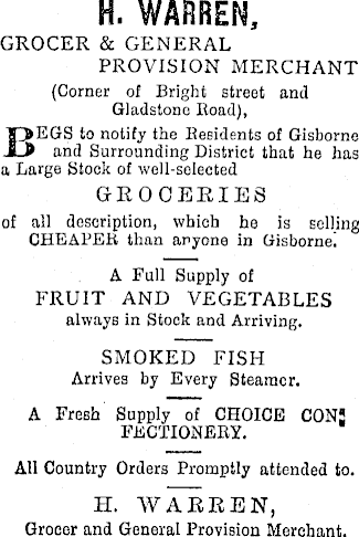H. WARREN, GROCER & GENERAL PROVISION MERCHANT (Corner of Bright street and Gladstone Boad), BEGS to notify the Besidents of Gisborne and Surrounding District that he has a Large Stock of well-selected GROCERIES of all description, which he is selling CHEAPER than anyone in Gisborne! A Full Supply of FRUIT AND VEGETABLES always in Stock and Arriving. SMOKED FISH Arrives by Every Steamer. A Fresh Supply of CHOICE CONJ FKCTIONERY. All Country Orders Promptly attended to. H. WARREN, Grocer and General Provision Merchant.