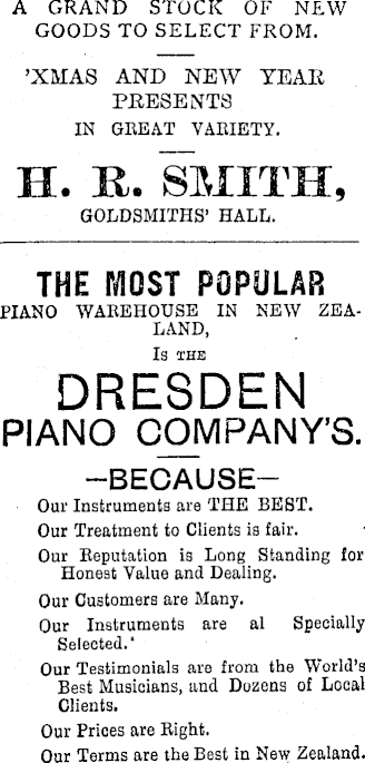A GRAND STOCK OF NEW GOODS TO SELECT FROM. ’XMAS AND NEW YEAR PRESENTS IN GREAT VARIETY. H. U. SMITH, GOLDSMITHS’ HALL. THE MOST POPULAR PIANO WAREHOUSE IN NEW ZEALAND, IS THE DRESDEN PIANO COMPANY'S. -BECAUSEOur Instruments are THE BEST. Our Treatment to Clients is fair. Our Reputation is Long Standing for Honest Value and Dealing. Our Customers are Many. Our Instruments are al Specially Selected.' Our Testimonials are from the World’s Best Musicians, and Dozens of Local Clients. Our Prices are Right. Our Terms are the Best in New Zealand.