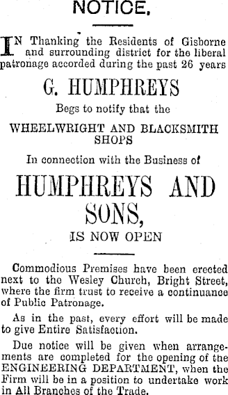NOTICE. IN Thanking the Residents of Gisborne and surrounding district for the liberal patronage accorded during the past 26 years G. HUMPHREYS Begs to notify that the WHEELWRIGHT AND BLACKSMITH SHOPS In connection with the Business of HUMPHREYS AND IS NOW OPEN Commodious Premises have been erected next to tho Wesley Church, Bright Street, where the firm trust to receive a oontinuanoe of Public Patronage. As in the past, every effort will be made to give Entire Satisfaction. Due notice will be given when arrangements are completed for the opening of tne ENGINEERING DEPARTMENT, when the Firm will be in a position to undertake work in All Branches of the Trade.