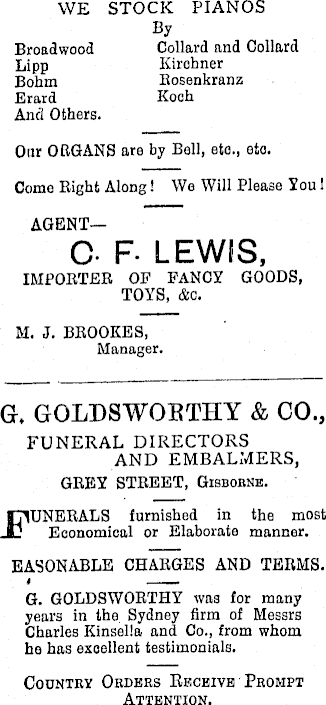 YVE STOCK PIANOS By Broadwood Collard and Collard Lipp Kirohner Bohm Bosenkranz Erard Koch And Others. Our ORGANS are by Bell, etc., eto. Come Right Along! We Will Please You 1 AGENT— C- F- LEWIS, IMPORTER OP FANCY GOODS, TOYS, &c. M. J. BROOKES, Manager. G, GOLDSWOBTHY & CO., FUNERAL DIRECTORS AND EMBALMERS, GREY STREET, Gisborne. [TVUNERALS furnished in the most Jj Economical or Elaborate manner. EASONABLE CHARGES AND TERMS. G. GOLDSWORTHY was for many years in the Sydney firm of Messrs Charles Kinsella and Co., from whom he has excellent testimonials. Country Orders Receive Prompt Attention.