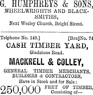 G. HUMPHREYS & SONS, .WHEELWRIGHTS AND BLACKSMITHS* Nest Wesley Church, Bright Street. Telphone No. 149.] [BoxJNo. 74 CASH TIMBER YARD, Gladstone Road. MACKRELL & COLLEY, GENERAL TIMBER MERCHANTS, BUILDERS & CONTRACTORS, Have in Stock and for Sale: OKH finn °E TIMBER, Zl jConsisting of—