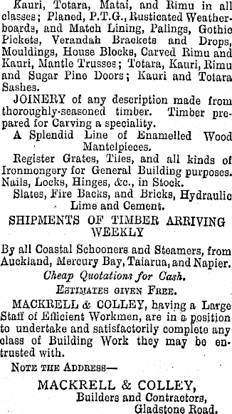 Kauri, Totara, Matai, and Rimu in all classes; Planed, P.T.G.,Rusticated Weatherboards, and Match Lining, Palings, Gothic Pickets, Verandah Brackets and Drops, Mouldings, House Blocks, Carved Rimu and Kauri, Mantle Trusses; Totara, Kauri, Rimu and Sugar Pine Doors; Kauri and Totara Sashes. JOINERY of any description made from thoroughly-seasoned timber. Timber prepared for Carving a speciality. A Splendid Line of Enamelled Wood Mantelpieces. Register Grates, Tiles, and all kinds of Ironmongery for General Building purposes. Nails, Locks, Hinges, &c., in Stock. Slates, Eire Backs, and Bricks, Hydraulic Lime and Cement. SHIPMENTS OF TIMBER ARRIVING WEEKLY By all Coastal Schooners and Steamers, from Auckland, Mercury Bay, Taiarua, and Napier. Cheap Quotations for Cash. Estimates given Free. MACKRELL & COLLEY, having a Large Staff of Efficient Workmen, are in a position to undertake and satisfactorily complete any olass of Building Work they may be entrusted with. Note the Address— MACKRELL & COLLEY, Builders and Contractors, Gladstone Road.