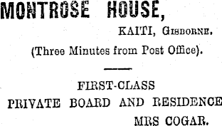 KAITI, Gisborne. (Three Minutes from Post Office). FIRST-CBASS PRIVATE BOARD AND RESIDENCE MRS COGAR.