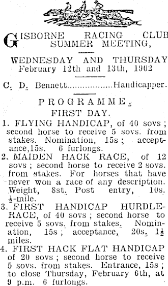 "N ISBORNE RACING CLUB JT SUMMER MEETING, WEDNESDAY AND THURSDAY February 12th and 13th, 1902 C. D. Bennett Handicapper. PROGR A M M E . FIRST DAY. 1. FLYING HANDICAP, of 40 sovs ; second horse to receive 5 sovs. from stakes. Nomination, 15s : acceptance,lss. (i furlongs. 2. MAIDEN HACK RACE, of 12 sovs ; second horse to receive 2 sovs. from stakes. For horses that have never won a race of any description. Weight, Bst. Post entry, 10s. 1-mile. 3. "FIRST HANDICAP HURDLERACE, of 40 sovs ; second horse to receive 5 sovs. from stakes. Nomination, 15s ; acceptance, 20s. 11 miles. 4. FIRST PIACIv FLAT HANDICAP of 20 sovs ; second horse to receive 5 sovs. from stakes. Entrance, 15s ; to close Thursday, February Cth, at 9 p.m. 6 furlongs.