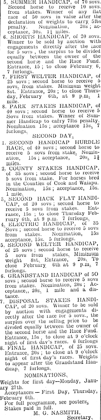 5. SUMMER HANDICAP, of 70 sovs., Second horse to receive 10 sovs. from stakes. Winner of any flat race of 50 sovs in value after the declaration of weights to carry, Gibs penalty. Nomination, 20s ; acceptance, 30s. 14 miles. 6. SHORTS HANDICAP, of 20 sovs. Winner to be sold by auction with engagements directly after the lace for 5 sovs , the surplus to be divided equally between the owner of the second horse and the Race Fund. Entrance, 15 ; to close February 0, 7 furlongs. 7. FIRST WELTER HANDICAP, of 25 sovs ; second horse to receive 5 sovs. from stakes. Minimum weight Sst." Entrance, 20s ; to close Thursday, February 6th, at 9 p.im 1 mile. 8. PARK STAKES HANDICAP, of 40 sovs ; second horse to receive 5 Sovs from stakes. Winner of Summer Handicap to carry 71bs penalty. Nomination 15s ; acceptance 155., 7 furlongs. SECOND DAY. 1. SECOND HANDICAP HURDLE RACE, of 40 sovs ; second horse to receive 5 sovs from stake. Nomination, 15s ; acceptance, 20S;, If miles. 2. COUNTY STAKES HANDICAP, of 35 sovs ; second horse to receive 5 sovs from stake. For horses bred in the Counties of Cook and Waiapu. Nomination, las ; acceptance, 15s. 1 mile. S. SECOND HACK FLAT I-lANDI-"CAP, ol 20 sovs ; second to receive 5 sovs from stakes. Entrance, 15s ; to close Thursday February 6th, at 9 p.m. 7 furlongs. 4. ELECTRIC HANDICAP, of 35 Sovs ; second horse to receive 5 sovs from stakes. Nomination, 15s acceptance, 15s. 5 furlongs. 5. SECOND WELTER HANDICAP, of 25 sovs ; second horse to receive 5 sovs from stakes. Mimimum weight Sst. Entrance, 20s. lo close February, 6th at 9 p.rm 7 furlongs. „ „ 6. GRANDSTAND HANDICAP of 50 sovs ; second horse to receive 5 sovs from stakes. Nomination, 20s ; Acceptance,, 20s, 1 mile and a distance. , ~ 7. DISPOSAL STAKES HANDICAP, of 20 sovs. Winner to be sold by auction with engagements directly after the lace for 5 sovs., the surplus over Hie selling price to be divided equally between the owner of the second horse and the Race Fund. Entrance, 15s , to close at 9 o’clock night of first day’s races. 6 furlongs 8. FINAL HANDICAP, of 25 sovs. Entrance, 20s ; to close at 9 o’clock night of first day’s races. Weights to appear after the Grandstand Handicap. 7 furlongs, NOMINATIONS, Weights for first day—Monday, January 27 th. Acceptances First Day, Ilmrsifay, February 6th. For full programme, see posters,, Stakes paid in full. M. G. NASMITH, Secretary,