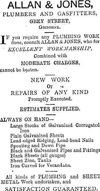 ALLAN & JONES, PLUMBERS AND GASFITTERS, GREY STREET, Gisborne. IF you require any PLUMBING WORK clone, consult ALLAN & JONES, who for EXCELLENT WORKMANSHIP, Combined with MODERATE CHARGES, cannot bo beaten. NEW WORK Or ■« REPAIRS OF ANY KIND Promptly Executed. ESTIMATES SUPPLIED. ALWAYS ON HAND— Large Stocks of Galvanised Corrugated Iron Plain Galvanised Sheets Lead-edged Ridging, Lead-head Nails Spouting and Down Pipe Black and Galvanised Pipes and Fittings Black Sheets (all gauges) Sheet Zinc, Tanks Iron Curved for Verandahs. All kinds of PLUMBING and SHEET METAL Work undertaken, and SATISFACTION GUARANTEED.