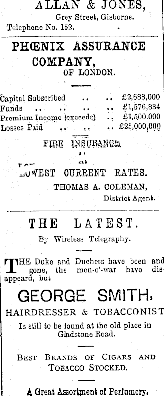 ALLAN & JONES, Grey Street, Gisborne. Telephone No. 152. PHffiNIX ASSURANCE COMPANY, OF LONDON. Capital Subscribed .. .. £2,683,000 Funds •• «• •• •• £1,576,834 Premium Income (exceeds) .. £1,5.00,000 Losses Paid ~ • • • • £25,000,00(1 FIDE IN SUMS S£, T /» THOMAS A. COLEMAN, District Agent. THE LATEST. By Wireless Telegraphy. THE Duke and Duchess have been and gone, the men-o'-war have di3appeard, but GEORGE SMITH. HAIRDRESSER & TOBACCONIST Is still to be found at the old place in Gladstone Road. Best Brands of Cigars and Tobacco Stocked. A Great Assortment oi Perfumery.