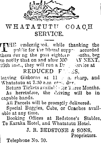 WHATATUTT7 COACH SERVICE. ryiEF undersigied. while thanking the JL public for Vie libera! supp- accorded them dur ng the past eighteen 'nths, beg to notify that on and after MO VY NEXT, doth inst., they will run a Ur Venice at REDUCED F . XS, leaving Gisborne at 11 a. sharp, and Whatatutu at 7.00 n.m rr~i. dor. Return Tickets avail*!-! • .or ’I uree Months. As heretofore, the driving will be in capable hands. All Parcels will be promptly delivered. Special Buggies, Cabs, or Coaches available at any time. Booking Offices at Redstone’s Stables, To Kanaka Hotel, and Whatatutu Hotel. J. R. REDSTONE & SONS, Proprietors. Telephone No. 70.