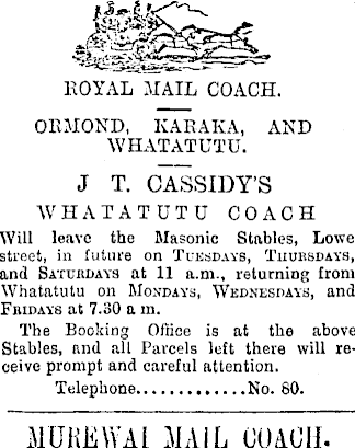 ROYAL MAIL COACH. ORMOND, KARAKA, AND WHATATUTU. J T. CASSIDY’S WHATATUTU COACH Will leave the Masonic Stables, Lowe street, in future on Tuesdays, Thursdays, and Saturdays at 11 a.m., returning from Whatatutu on Mondays, Wednesdays, and Fridays at 7.30 a in. The Booking Ofiice is at the above Stables, and all Parcels left there will receive prompt and careful attention. Telephone No. 80. MUKEWAI MiL COACH