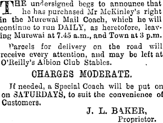 [”IHE undersigned begs to announce that JL he has purchased Mr McKinley’s right in the Murewai Mail Coach, which he will continue to run DAILY, as heretofore, leaving Murewai at 7.45 a.m., and Town at 3 p.m. Parcels for delivery on the road will receive every attention, and may be left at O’Reilly’s Albion Club Stables. CHARGES MODERATE. If needed, a Special Coach will be put on on SATURDAYS, to suit the convenience of Customers. J. L. BAKER, Proprietor.