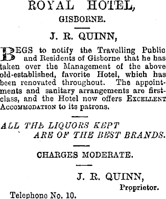 ROYAL HOTEL, GISBORNE. J. E. QUINN, BEGS to notify the Travelling Public and Residents of Gisborne that he has taken over the Management of the above old-established, favorite Hotel, which has been renovated throughout. The appointments and sanitary arrangements are firstclass, and the Hotel now offers Excellent Accommodation to its patrons. ALL THE LIQUORS KEPT ' ARE OF THE BEST BRANDS. CHARGES MODERATE. J. E. QUINN, Proprietor. Telephone No. 10.