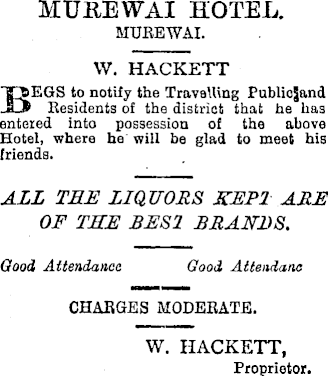 MUKEWAI HOTEL. MUREWAI. W. HACKETT BEGS to notify the Travailing Publicjand Residents of the district that he has entered into possession of the above Hotel, where he will be glad to meet his friends. ALL TEE LIQUORS KEPT ARE OF TEE BEST BRANDS. Good Attendance Good Attendane CHARGES MODERATE. W. HACKETT, Proprietor.