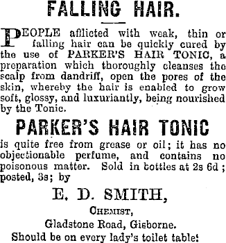 PEOPLE afflicted with weak, thin or falling hair can he quickly cured by the use of PARKER’S HAIR TONIC, a preparation which thoroughly cleanses the scalp from dandrill, open the pores of the skin, whereby the hair is enabled to grow soft, glossy, and luxuriantly, being nourished by the Tonic. PARKEB’S HAIR TONIC is quite free from grease or oil; it has no objectionable perfume, and contains no poisonous matter. Sold in bottles at 2s 6d ; posted, 3s; by E, D. SMITH, Chemist, Gladstone Road, Gisborne. Should be on every lady’s toilet table!