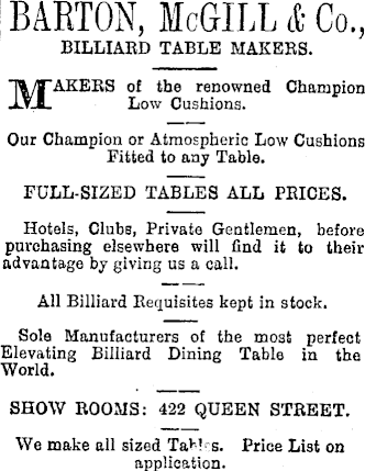 BARTON, McGILL & Co., BILLIARD TABLE MAKERS. MAKERS of the renowned Champion Low Cushions. Our Champion or Atmospheric Low Cushions Fitted to any Table. FULL-SIZED TABLES ALL PRICES. Hotels, Clubs, Private Gentlemen, before purchasing elsewhere will find it to their advantage by giving us a call. All Billiard Requisites kept in stock. Sole Manufacturers of the mo3t perfect Elevating Billiard Dining Table in the World. SHOW ROOMS: 422 QUEEN STREET, j We make all sized s. Price List on application.