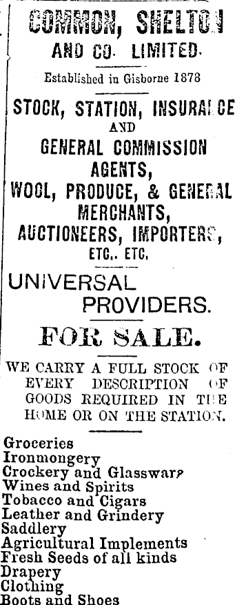 SHE ANB ca LIK!IT£D Established in Gisborne 1878 STOCK, STATION, INSURA! CE AND GENERAL COMMISSION AGENTS, WOOL, PRODUCE, & GENERAL MERCHANTS, AUCTIONEERS, IMPORTER' , ETC.. ETC. UNIVERSAL PROVIDERS. FOE, BALE. WE CARRY A FULL STOCK <>F EVERY DESCRIPTION ( F GOODS REQUIRED IN TI E Hi'ME OR ON THE STATION. Groceries Ironmongery Crockery and Glassware Wines and Spirits Tobacco and Cigars Leather and Grindery Saddlery Agricultural Implements Fresh Seeds of all kinds Drapery Clotning Boots and Shoes Si OH!! fH Oil