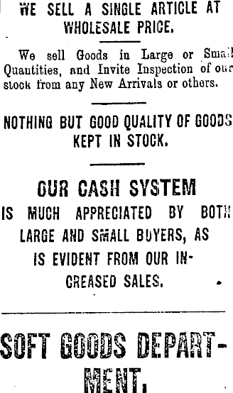WE SELL A SINGLE ARTICLE AT WHOLESALE PRICE, We sell Goods in Large or Srna.l Quantities, and Invite Inspection of our slock from any Hew Arrivals or others. NOTHING BUT GOOD QUALITY OF GOODS KEPT IN STOCK. GUR CASH SYSTEM IS MUCH APPRECIATED BY BOTH LARGE AND SMALL BOYERS, AS IS EVIDENT FROM OUR INCREASED SALES. SOFT MBS DEPART i