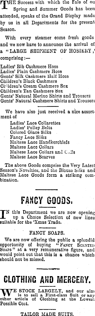 fTTHE Success with which the Sale ot ou Spring and Summer Goods has been attended, speaks of the Grand Display made by us in all Departments for the present Season. With every steamer come fresh goods and we now have to announae the arrival of a “ LAKGE SHIPMENT OP HOSIKEY comprising Ladies’ Kib Cashmere Hose Ladies’ Plain Cashmere Hose Gents’ Silk Cashmere Half Hose Children’s Black Cashmere Cb'ddren’s Cream Cashmere Sox Children’s Tan Cashmere Hox Gents’ Natural Merino Shirts and Trousers Gents’ Natural Cashmere Shirtß and Trousers We have also just received a nice assortment of Ladies’ Lace Collarettes Ladies’ Pulley Belts Colored Glace Silks Fancy Laee Silks Maltese Laee Handkerchiefs Maltese Lace Collars Maltese Laee Collars and Cuffs Maltese Laee Scarves The above Goods comprise the Very Latest Season's Novelties, and the Blouse Silks and Maltese Laee Goods form a striking combination. FANCY GOODS. IN this Department we aro now opening up a Choice Selection of now lines suitable for the ’Xmas Trade. FANCY SOAPS. We are now offering the public a splendid opportunity of buying “ Fancy Scextejj Soaps” at a very remunerative figure, and would point out that this is a chance which should not be missed. CLOTHING AND MERCERY. WE STOCK LARGELY, and our aim is to sell a First-class Suit or any other article of Clothing at the Lowes: Possible Cost. TAILOR MADE SUITS.