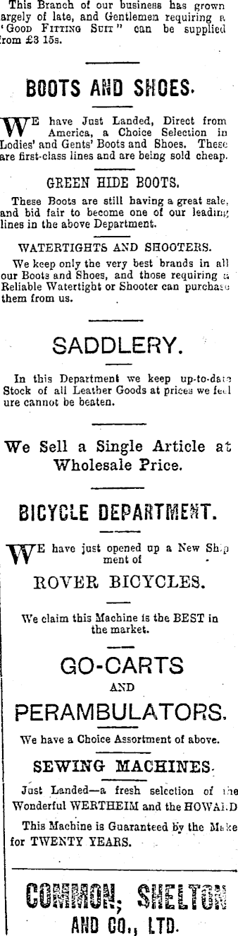 This Branch o! our business has grown largely of late, and Gentlemen requiring i>. “Good Fitting Suit ’’ can be supplied from £3 15s. BOOTS AND SHOES. WE have Just Landed, Direct from America, a Choice Selection in Lodies’ and Gents’ Boots and Shoes. These are first-class lines and are being sold cheap, GREEN HIDE BOOTS. These Boots are still having a great sale, and bid fair to become one of our leading lines in the above Department, WATEBTIGHTS AND SHOOTEBS. We keep only the very best brands in all our Boot 3 and Shoes, and those requiring Reliable Watertight or Shooter can purcha; . them from us. SADDLERY. In this Department we keep up-to-da:-; Stock of all Leather Goods at prices we ft-1 ure cannot be beaten. We Sell a Single Article at Wholesale Price. BICYCLE DEPARTMENT. WE have just opened up a New Sh.p ment of ROYER BICYCLES. We claim this Machine is the BEST in the market. GO-CARTS AND PERAMBULATORS, We have a Choice Assortment of above. SEWING MACHINESJust Landed—a fresh selection of :.ie Wonderful WEBTHEIM and the HOWAi .D This Machine is Guaranteed By the Make for TWENTY YEARS. AND GQ„ !fcl& LTD.