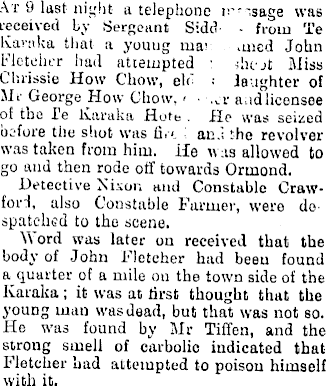At 9 last night a telephone m- sage was received by Sergeant Sidd - from Te Karaka that a young mat .uicd John Fletcher had attempted ■ flii-jt Miss Chrissie How Chow, eh laughter of Mr George How Chow, < .cr and licensee oi the Te Karaka Hurt . He was seized before the shot was fir* an.; ‘he revolver was taken from him. ile was allowed to go and then rode off towards Ormond. Detective Nison and Constable Crawford, also Constable Farmer, were do spatclisd to the scene. Y\ ord was later on received that the body of John Fletcher had been found a quarter of a mile on the town side of the Karaka; it was at first thought that the young man was dead, but that was not so. He was found by Mr TifTen, and the strong smell of carbolic indicated that Fletcher had attempted to poison himself with it.