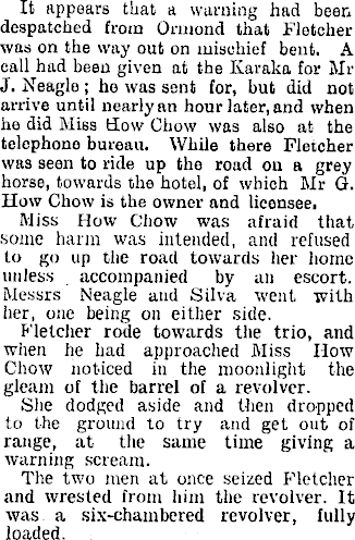 It appears that a warning had been despatched from Ormond that Fletcher was on the way out on mischief bent. A call had been given at the Karaka for Mr J. Neagle; he was sent for, but did not arrive until nearly an hour later, and when he did Miss How Chow was also at the telephone bureau. Whife there Fletcher was seen to ride up the road ou a grey horse, towards the hotel, of which Mr G. How Chow is the owner and licensee. Miss How Chow was afraid that some harm was intended, and refused to go up tiie road towards her home unless accompanied by an escort. Messrs Neagle and Silva went with her, one being on either side. Fletcher rode towards the trio, and when he had approached Miss How Chow noticed in the moonlight the gleam of the barrel of a revolver. She dodged aside and then dropped to the ground to try and get out of range, at the same time giving a warning scream. The two men at once seized Fletcher and wrested from him the revolver. It was a six-chambered revolver, fully loaded.