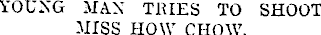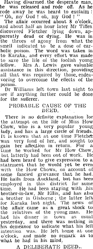 Having disarmed , the desperate man, lie was released and rode off. As lie rode away he was heard to exclaim : “ Oh, my God ! oh, my God ! ” The affair occurred about 8 o’clock, and about half an hour later Mr Tiffen discovered Fletcher lying down, apparently dead or dying. He was in the throes of agony from what the smell indicated to he a dose oi carbolic poison. The word was taken in to Karaka, and every effort was made to save the life of the foolish young fellow. Mrs A. Lewis gave valuable assistance in this direction, providing all that was required by those, endeavoring to overcome tiie effects of the poison. Dr Williams left town last night to see if anything further could lie done for the sufferer. PROBABLE CAUSE OF THE DEED, There is no definite explanation for the attempt on the life of Miss How Chow, who is a very popular young lady, and has a large circle of friends. It is known that at one time Fletcher was very fond of her, and sought to gain her affection in return. For a time he worked for Mr How Chow, but latterly had been out of work. He had been heard to give expression to a statement that he would yet be even with the How Chows, on account of some fancied grievance that iie had. He hails from Auckland, but has been employed in this district for some time. He had been staying with .his brother-in-law, Mr Ellis, and lias also a brother in Gisborne ; the latter left for Karaka last night. The news of the affair came as a great shock to the relatives of tiie young man. He had his dinner in town as usual yesterday, and there was nothing in his demeanor to indicate what his fell intention was. He left home at one o’clock, and made no remark as to what he had in his mind. A DELIBERATE DEED,