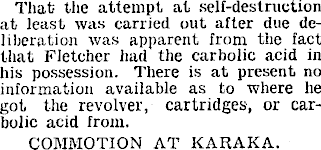 That the attempt at self-destruction at least was carried out after due deliberation was apparent from the fact that Fletcher laid the carbolic acid in his possession. There is at present no information available as to where he got the revolver, cartridges, or carbolic acid from. COMMOTION AT KARAKA.