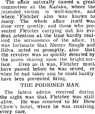 The affair naturally caused a great commotion at the Karaka, where the intended victim is well-known, and where ’ Fletcher also was known to many. The whole affair itself was ' done very quietly, and those who prevented Fletcher carrying out his evident intention at the time hardly realised the seriousness of the affair. It was fortunate that Messrs Neagle and Silva acted so promptly, also that the revolver was so quickly descried by the moon shining upon the bright surface. Even as it was, Fletcher must .have paused before lie was seized, or when iie had taken aim he could hardly have been prevented firing, THE POISONED MAN. The latest advice received during the night was that Fletcher was still alive. He was removed to Mr How Chow’s hotel, where he was receiving every care.