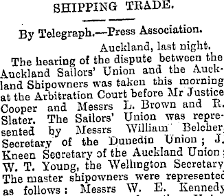SHIPPING TRADE. By Telegraph.—Press Association. Auckland, last night. The hearing of the dispute between the Auckland Sailors’ Union and the Auckland Shipowners was taken this morning at the Arbitration Court before Mr Justice Cooper and Messrs L. Brown and It. Slater. The Sailors’ Union was represented by Messrs William Belcher, Secretary of the Dunedin Onion ; J. Kneen Secretary of the Auckland Union ; W. T. Young, the Wellington Secretary. The master shipowners were represented as follows : Messrs W. E. Kennedy
