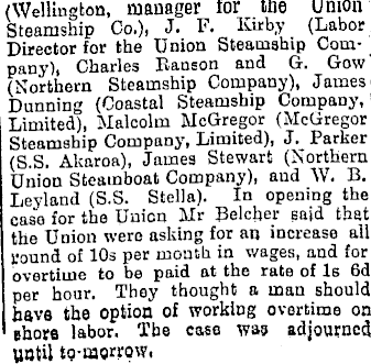 (Wellington, mauager for the Union Steamship Co.), J. F- Eirby (Labor Director for the Union Steamship Company), Charles Bauson and G. Gow] (Northern Steamship Company), James* Dunning (Coastal Steamship Company, E Limited), Malcolm McGregor (McGregor Steamship Company, Limited), J. Parker (S.S. Akaroa), James Stewart (Northern Union Steamboat Company), and W. B. Leyland (S.S. Stella). In opening the case for the Union Mr Belcher said that the Union were asking for an increase all pound of 10s per month in wages, and for overtime to be paid at the rate of Is 6d per hour. They thought a man should have the option of working overtime on shore labor. The case wag adjourned until to-morrow.