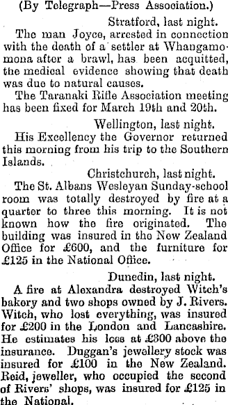 (By Telegraph—Press Association.) Stratford, last night. Tho man .Joyce, arrested in connection with the death of a settler at Whangamomona after a brawl, has been acquitted, the medioal evidence showing that death was due to natural causes. The Taranaki Rifle Association meeting has been fixed for March 19th and 20th. Wellington, last night. His Excellency the Governor returned this morning from his trip to the Southern Islands. Christchurch, last night. The St. Albans Wesleyan Sunday-school room was totally destroyed by fire at a quarter to three this morning. It is not known how the fire originated. The building was insured in tho New Zealand Office for £6OO, and the furniture for .£125 in the National Office. Dunedin, last night. A fire at Alexandra destroyed Witch’s bakery and two shops owned by J. Rivers. Witch, who lost everything, was insured for £2OO in the London and Lancashire. He estimates his Ices at £3OO above the insurance. Duggan’s jewellery stock was insured for £IOO in the New Zealand. Reid, jeweller, who occupied the second of Rivers’ shops, was insured for £125 in the National.