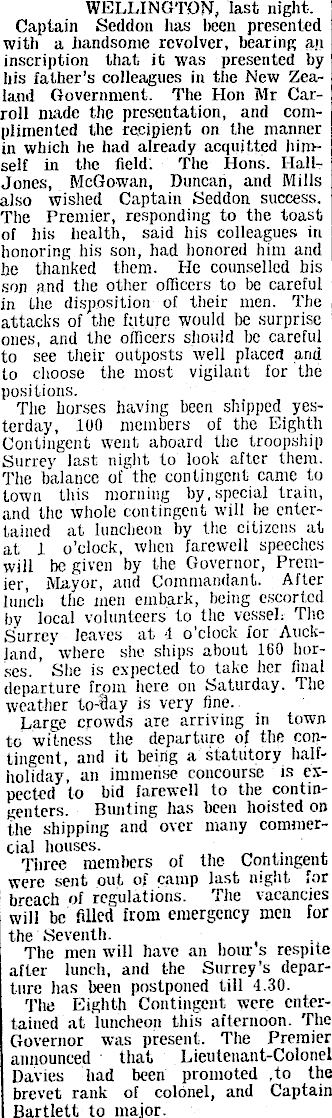 WELLINGTON, last night. Captain Seddon lias been presented with a handsome revolver, bearing ap inscription that it was presented by his father’s colleagues in the New Zealand Government. The Hon Mr Carroll made the presentation, and complimented the recipient on the manner in which he had already acquitted himself in the field. The I-lons. HallJones, McGowan, Duncan, and Mills also wished Captain Seddon success. The Premier, responding to the toast of his health, said his colleagues in honoring his son, had honored him and he thanked them. He counselled his son and the other officers to be careful in tiie disposition of their men. The attacks of the future would tie surprise ones, and the officers should be careful to see their outposts well placed and to choose the most vigilant for the positions. The horses having been shipped yesterday, 100 members of the Eighth Contingent went aboard the troopship Surrey last night to look after them. The balance of the contingent came to town this morning by,special train, and the whole contingent will be entertained at luncheon by the citizens at at 1 o’clock, when farewell speeches will be given by the Governor, Premier, Mayor, and Commandant. After lunch the men embark, being escorted by local volunteers to the vessel: The Surrey leaves at 4 o’clock for Auckland, where she ships about 160 horses. She is expected to take her final departure from here on Saturday. The weather to-oay is very fine. Large crowds are arriving in town to witness the departure of the contingent, and it being a statutory halfholiday, an immense concourse is expected to bid farewell to the contingenters. Bunting has been hoisted on the shipping and" over many commercial houses. .. Three members of the Contingent were sent out of camp last night *or b r each of regulations. The vacancies will be filled from emergency men for the Seventh. The men will have an hour’s respite after lunch, and the Surrey’s departure has been postponed till 4.30. The Eighth Contingent were entertained at luncheon this afternoon. The Governor was present. The Premier announced that Lieutenant-Colonel Davies had been promoted .to the brevet rank of colonel, and Captain Bartlett to major.