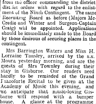from oho officer commanding the district, dist.iol orders with regard to the enlistment of the Ninth Contingent. The same Recruiting Board as before (Majors McCredie and Winter and Surgeon-Captain Craig) will be appointed. Applications should be immediately made to the Board by those desirous of securing places in the contingent, Mrs Barrington Waters and Miss I-I. Lorraine Tansley, arrived by the s.s\ Moura yesterday morning, and are the guests of Mrs Townley during their stay in Gisborne. Our readers need hardly to be reminded of the Grand F tanoforte Recital to be given at the Academy of Music this evening, and we anticipate that music-loving Gisborne will respond with a bumper house. A glance at the programme