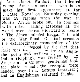 Miss Janet Waldorf, the talented young American actress, who is to make her first appearance at the Theatre Royal on .Saturday evening, was at Taiping when the war in South Africa broke out. In common with other leading actresses all the world over, she came forward to recite “ The Absent-minded Beggar " in aid of the War Fund. On that occasion the extraordinary cosmopolite of the -mpneed by the fact that East, wfis fv..— t v an Anglotiie poem was writwn „„ Indian (Kipling), was recuCd by American ; a Chinese gentleman took the plate round; the receipts were handed over to a Scotch treasurer , and an Englishman returned thanks.