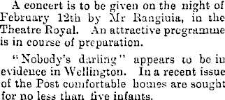 A concert is to be given on the night of February 12th by Mr Rangiuia, in the Theatre Royal. An attractive programme is in course of preparation. “Nobody’s darling” appears to be in evidence in Wellington. In a recent issue of the Post comfortable homes are sought for no less than five infants.