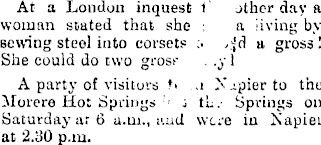 At a London inquest t other day a woman stated that she a living by sewing steel into corsets ,:jd u gross! She could do two gross ..y 1 A party of visitors '• .1 Napier to the Morere Hot Springs , If. Springs on Saturday ar 6 a.m., and were in Napier at 2.30 p.m.