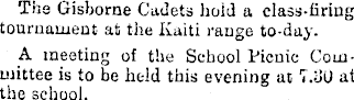 The Gisborne Cadets hold a class-firing tournament at the Kaiti range to-day. A meeting of the School Picnic Committee is to be held this evening at 7.3 U at tiie school.